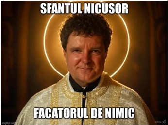 Ce mème transfigure Nicușor Dan en figure de saint, en plaçant derrière sa tête une auréole lumineuse et dorée, rappelant les iconographies traditionnelles de sainteté. Le texte « le Saint Nicușor, le faiseur de rien » introduit une dimension humoristique et ironique, tournant en dérision le candidat aux élections. L’ensemble de l’image crée une atmosphère de parodie, mobilisant des éléments visuels associés à la sacralité pour produire un effet à la fois comique et critique, soulignant l’intention satirique du mème.