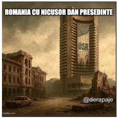 Le mème « La Roumanie avec Nicușor Dan » mobilise une scénographie post-apocalyptique pour construire un positionnement discursif ouvertement catastrophiste à l’égard de la figure évoquée. Le paysage urbain en ruines, les bâtiments effondrés et l’esthétique générale de désolation configurent un ethos négatif, non pas du personnage lui-même, mais de la conséquence anticipée de son accession au pouvoir. Cette projection dystopique résonne également avec un discours plus large sur le déclin supposé du parti politique qu’il a initialement fondé, bien qu’il n’en soit plus le président.