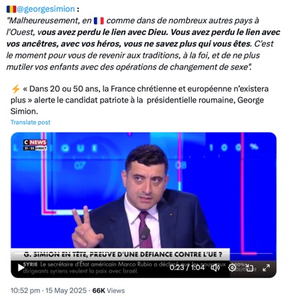 George Simion a remporté le premier tour de l’élection, en grande partie grâce à une stratégie numérique agressive visant à diffuser des messages simplifiés et émotionnellement chargés, souvent accompagnés de hashtags tels que #RomâniaUnită ou #SimionPreședinte. Son discours nationaliste, centré sur la souveraineté roumaine, la critique des élites traditionnelles et l’opposition à l’Union européenne, a trouvé un écho particulier auprès des électeurs ruraux et désillusionnés sur des plateformes comme Facebook, Instagram et TikTok.